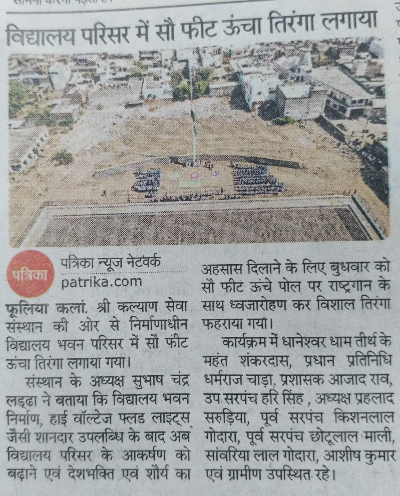 फूलिया कलां (पत्रिका न्यूज नेटवर्क)। श्री कल्याण सेवा संस्थान के निर्माणाधीन विद्यालय भवन परिसर में बुधवार को एक भव्य कार्यक्रम आयोजित किया गया, जिसमें सौ फीट ऊंचे पोल पर राष्ट्रीय ध्वज तिरंगा फहराया गया। राष्ट्रगान की धुन के साथ हुए इस ध्वजारोहण ने उपस्थित सभी लोगों को देशभक्ति और राष्ट्रीय गौरव की भावना से ओतप्रोत कर दिया।